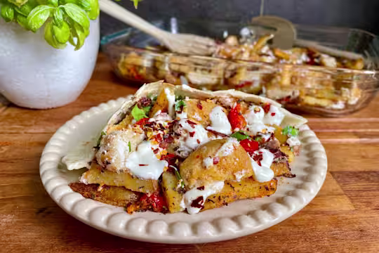 - Fyll sedan tortillan med gyrosblandningen och toppa med såsen, färsk oregano och chilisalt.