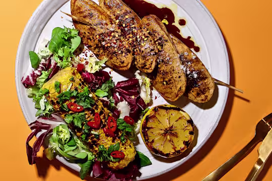 - Dela majskolvarna och pensla med olivolja. Grilla dem på medelvärme cirka 5-10 minuter tills de fått fin färg. Salta och peppra.